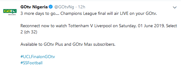 Gotv Nigeria On Twitter It S Almost Time Which Team Has Your Support This Evening For The Uefa Champions League Final Catch It Tonight At 8pm On Select 2 Ch 32 Uclfinal Available